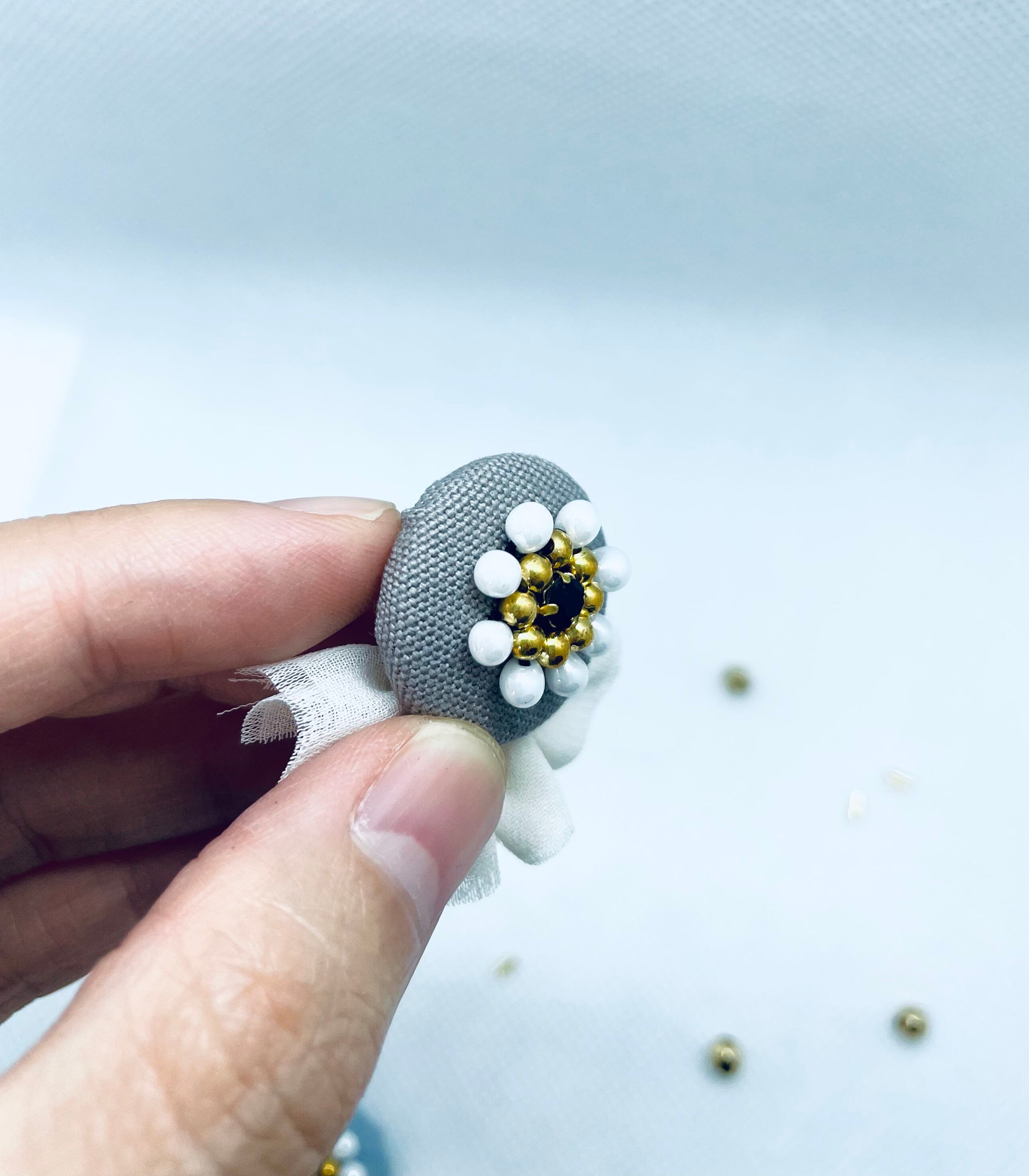 こちらの作品は、頭部分はくるみボタンにビジューとビーズ、マガ玉で花模様にし、くらげの足部分にシフォン素材のフリルをつけ、耳元でかわいらしさを演出してくれます。