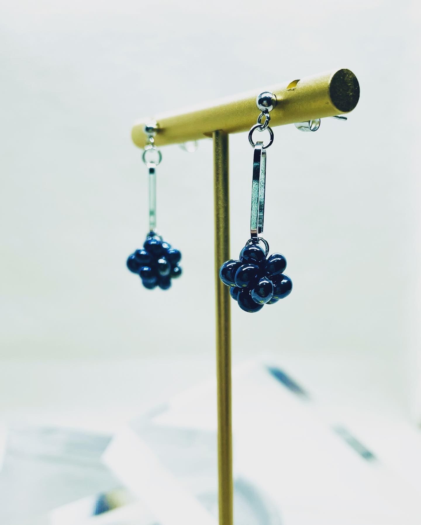 まが玉をテグスで実みたいに丸く編んだものをフープと合わせています。