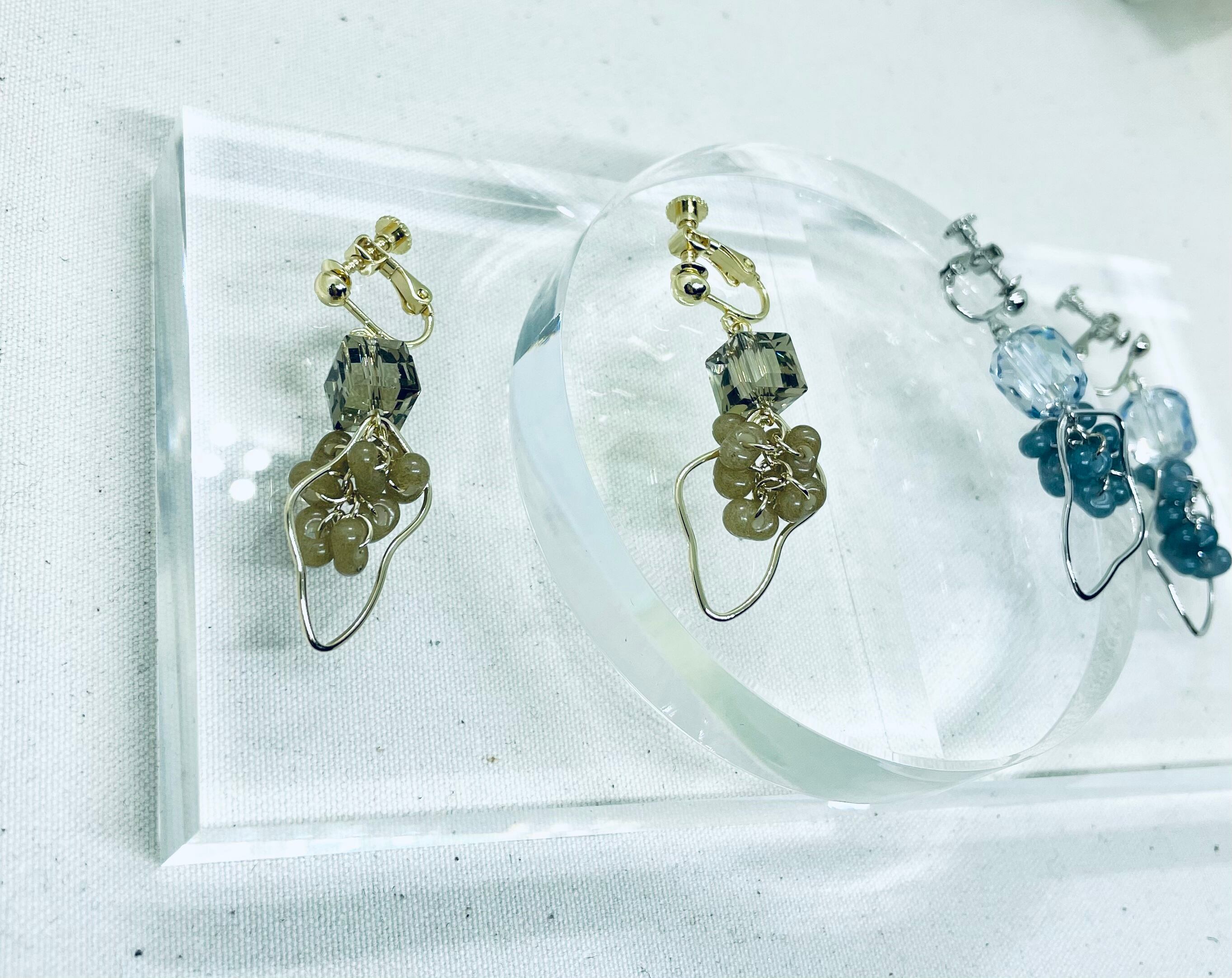 こちらの作品はくすみピンクのファルファーレというビーズを使用したピアスorイヤリングになります。