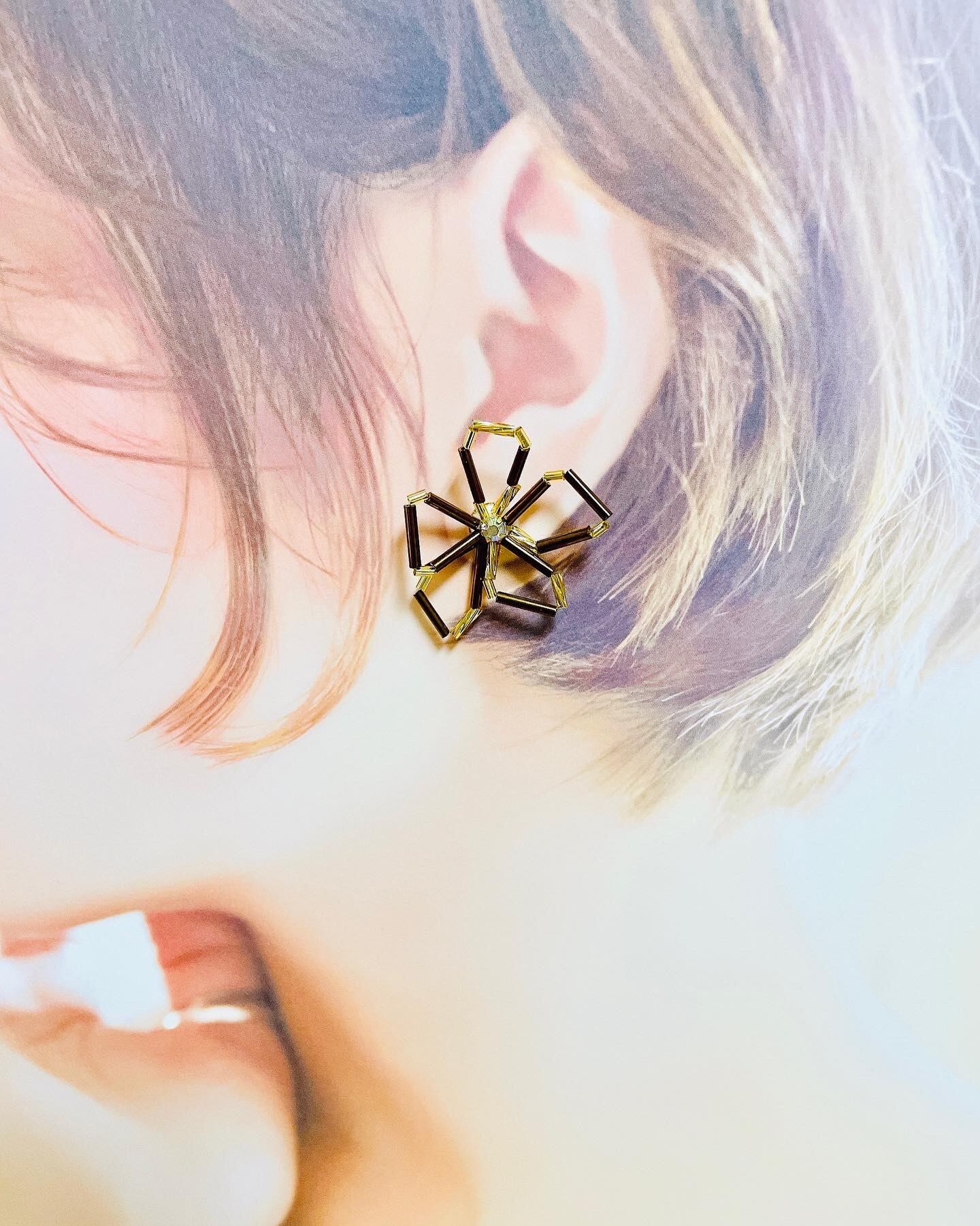 #竹ビーズ#花#お花のピアス#お花のイヤリング#竹ビーズ#輪郭#ブラック#ブラウン#タマムシ#変形#お花の輪郭#ビーズピアス#ビーズ イヤリング
