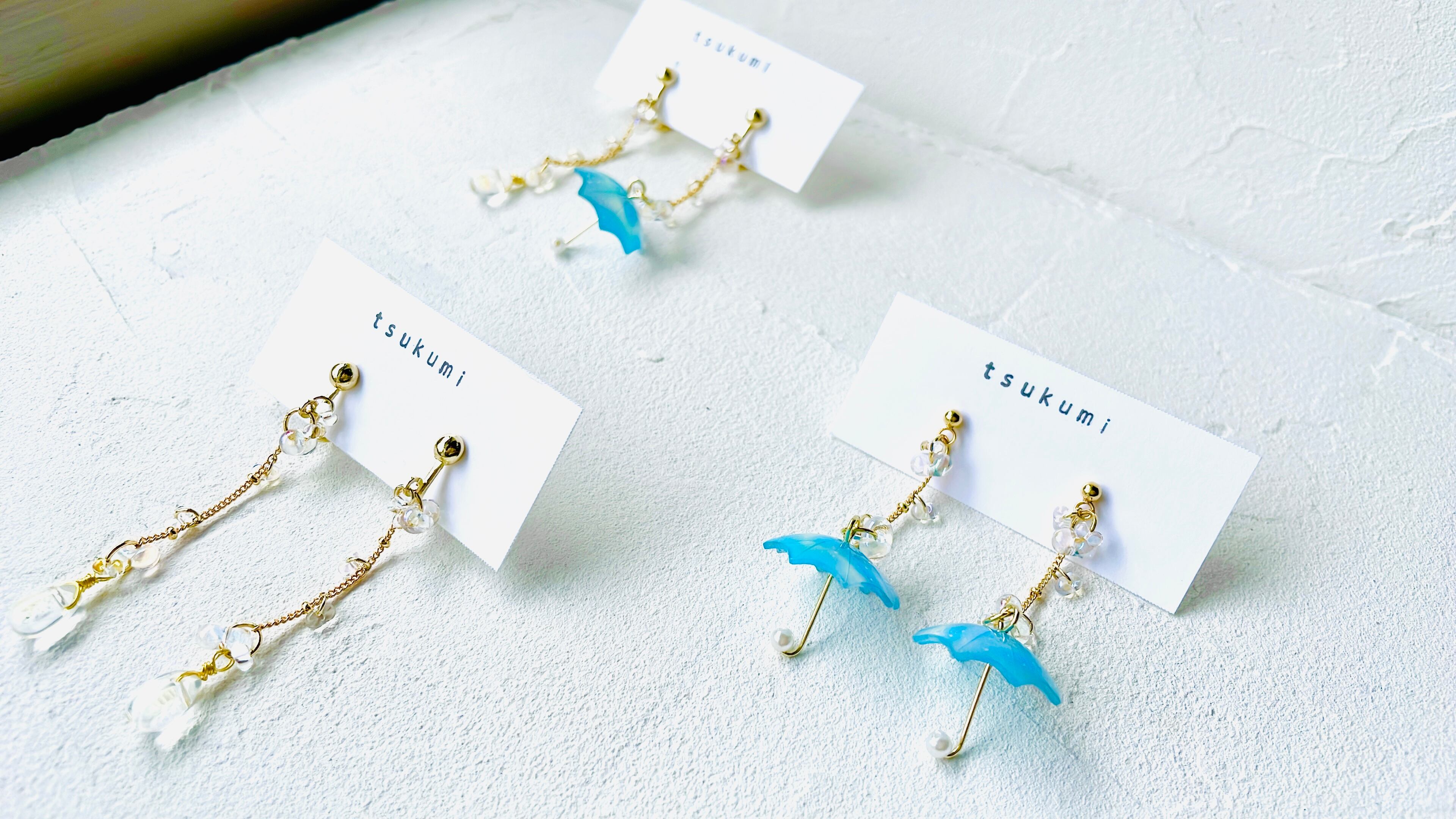 こちらの作品は傘とチェコビーズを使用した耳飾りです。