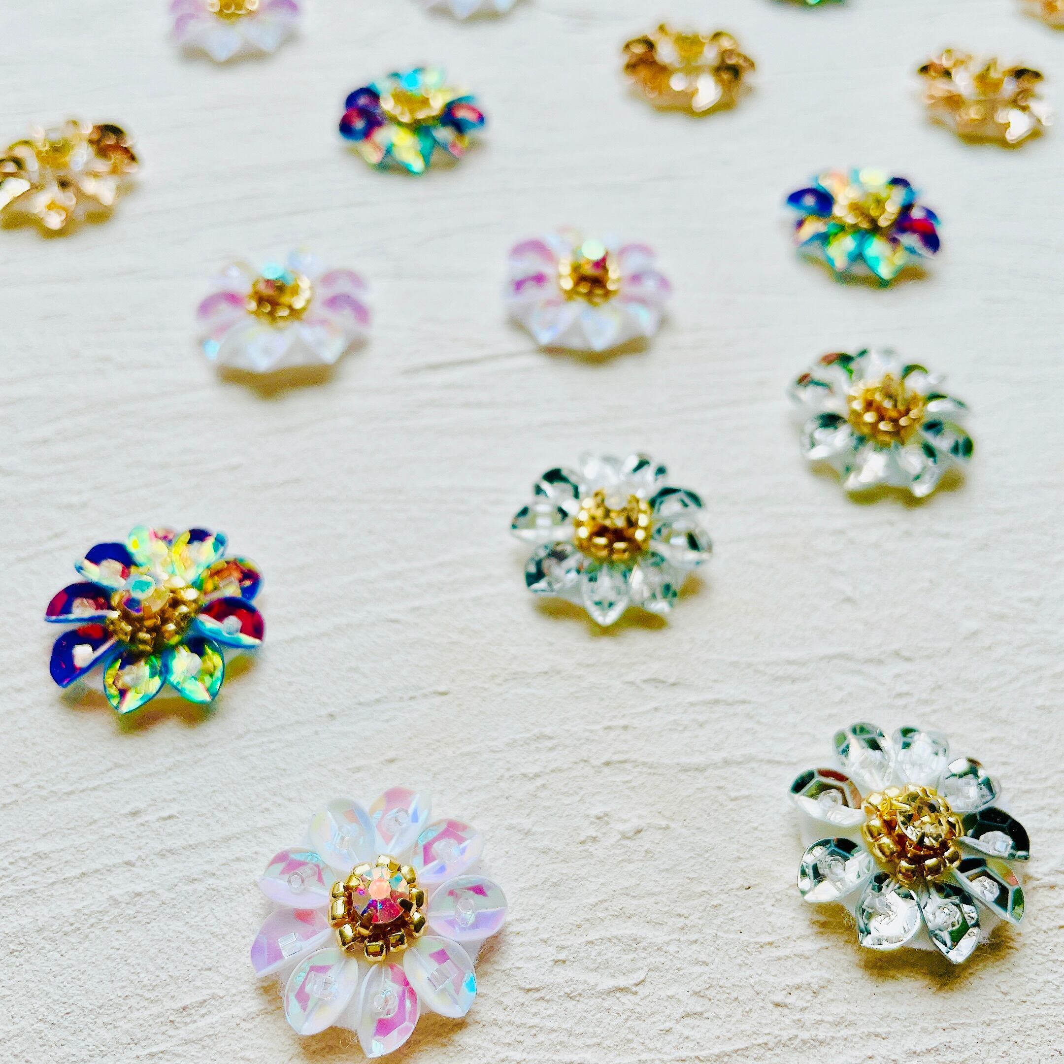 お花の中心にオーロラカラーのビジューか小さいパールを縫い付け、折ったスパンコールとビーズをお花の花びらのように縫い付けています。
