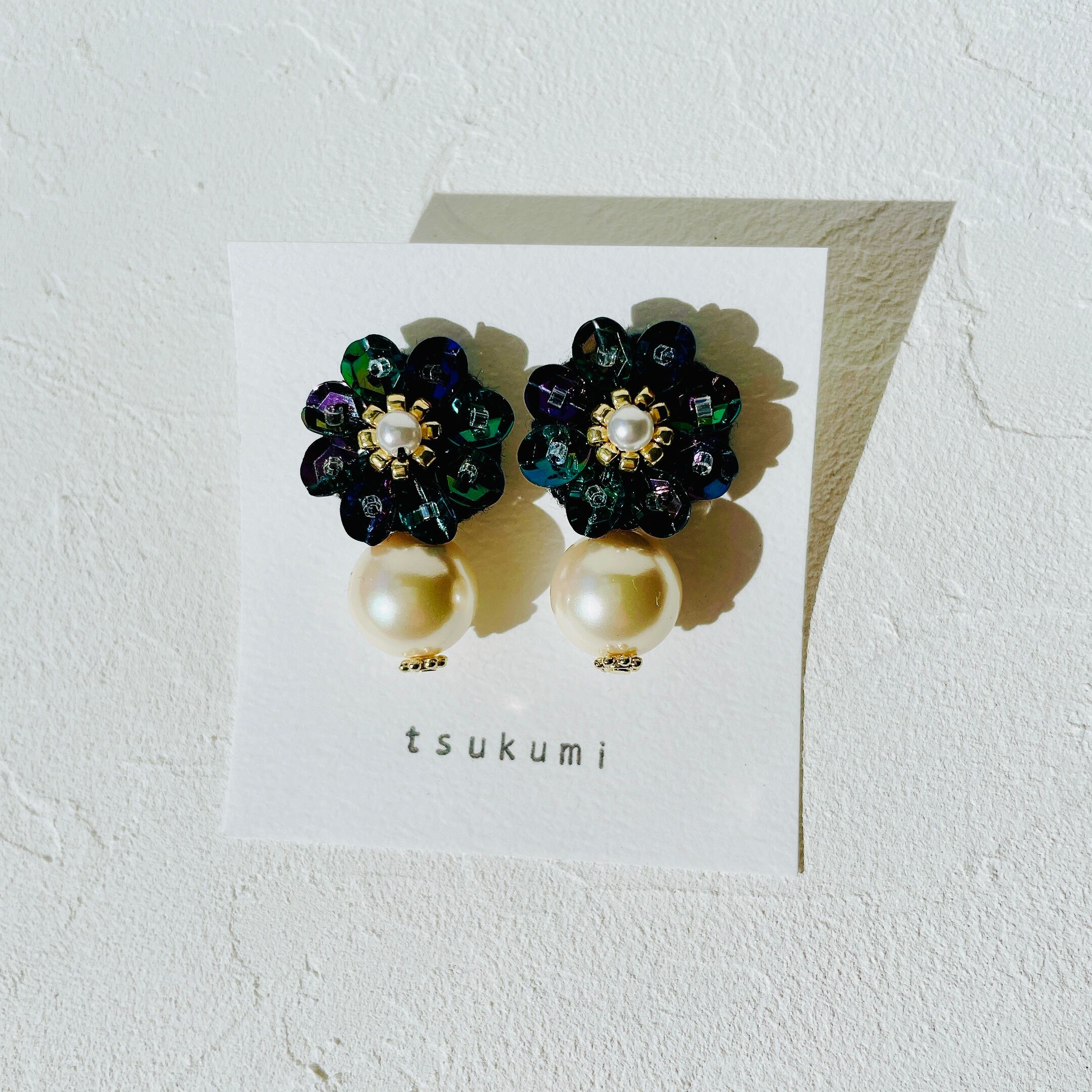 -華- スパンコール レインボーブラック/お花/パール/ ピアス/イヤリング