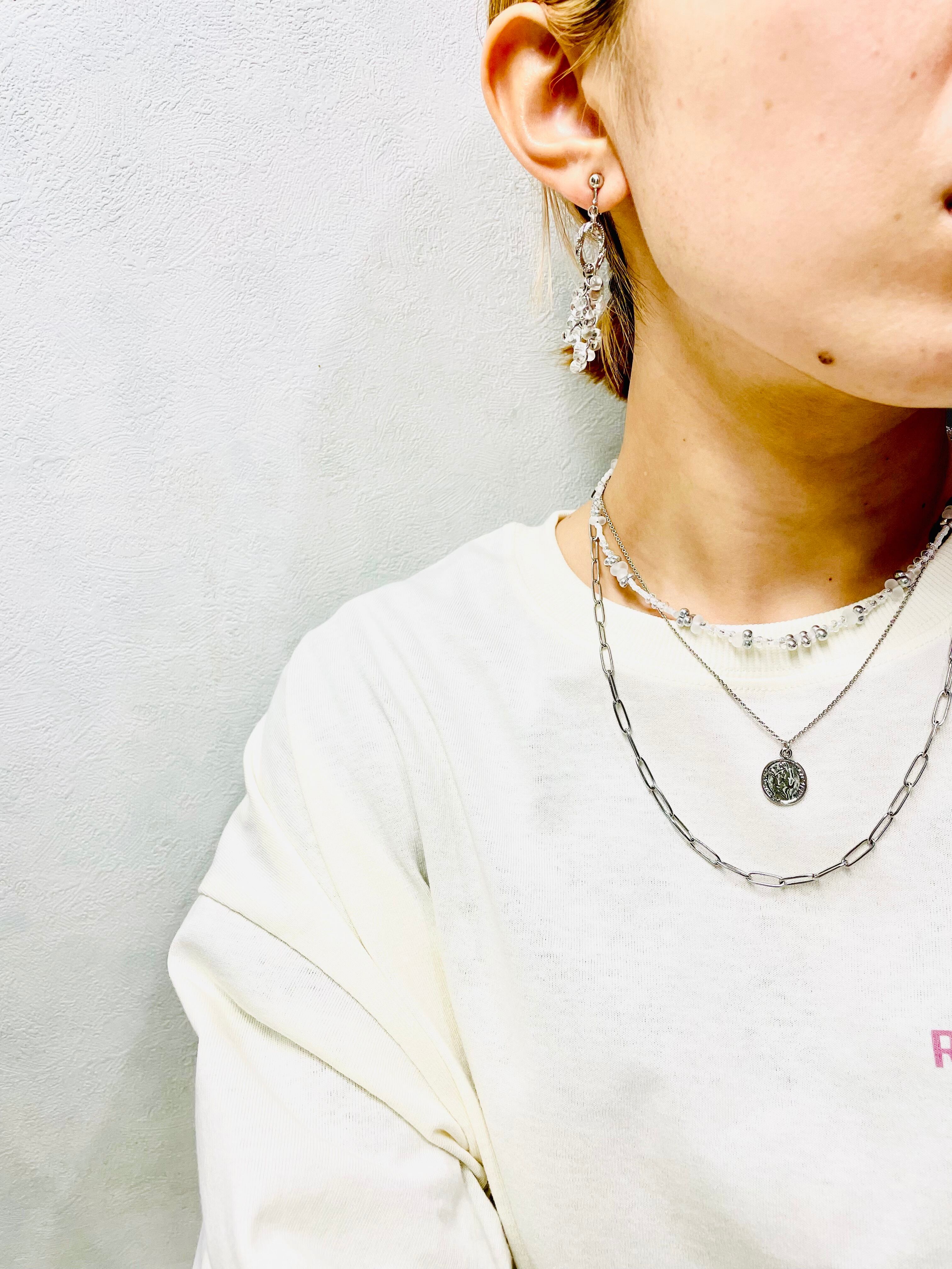 ピアス、イヤリング金具部分はサージカルステンレスですが、丸カンやそのほかの金属は異なる素材を使用しています。